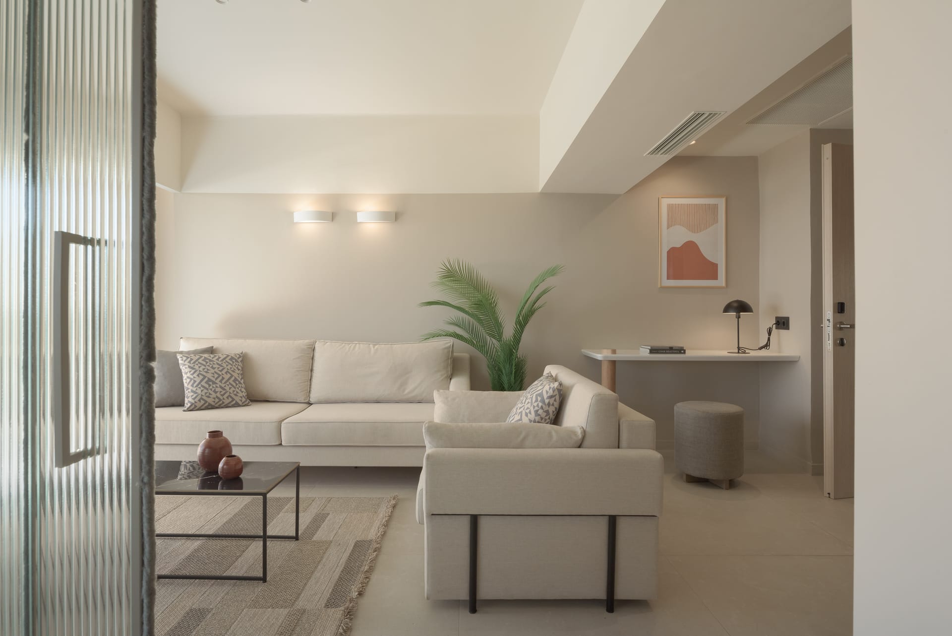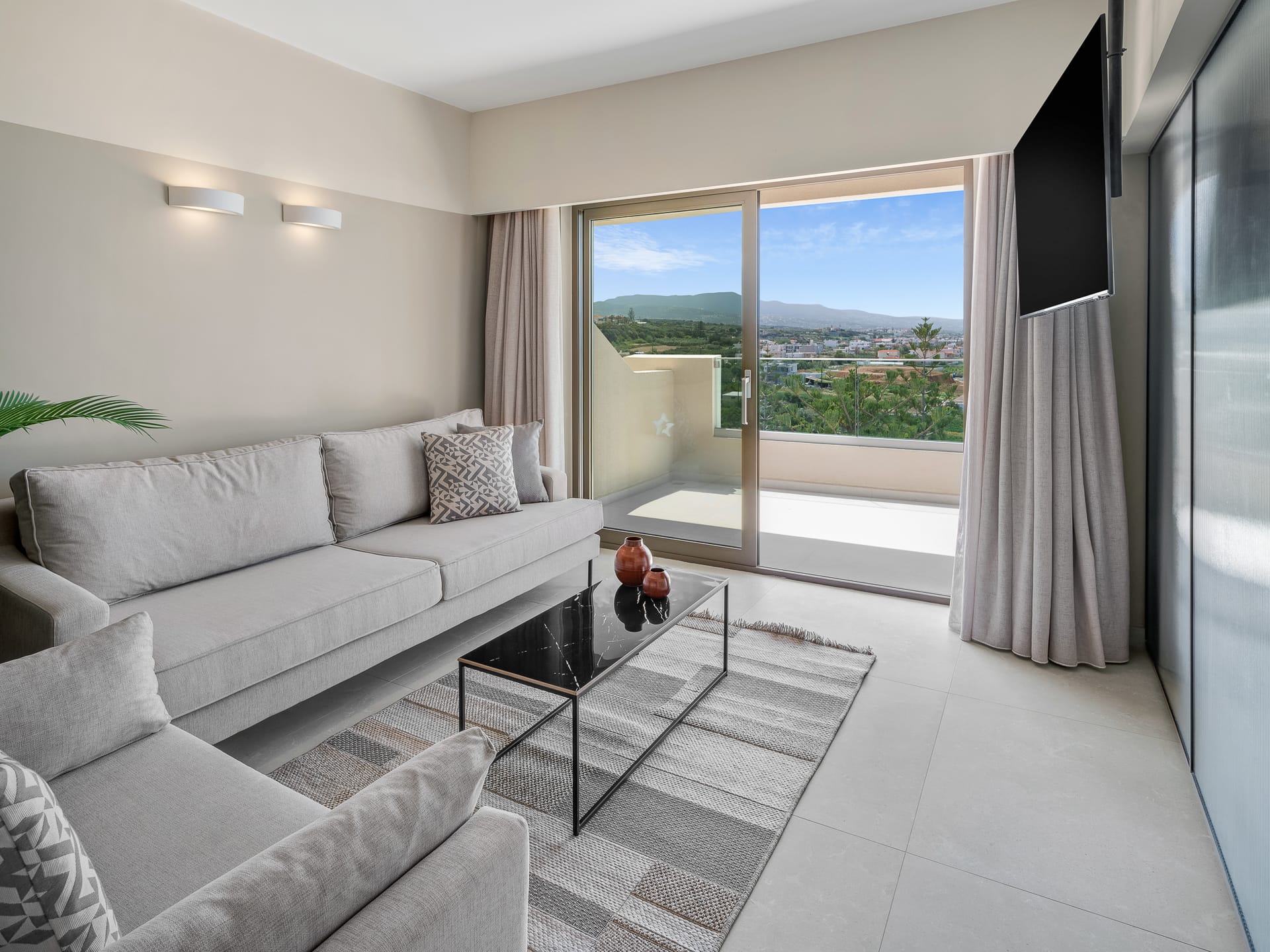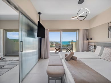 Located on a high floor, with amazing views of the mountains and the sea these elegant Junior Suites offer a bedroom with a double bed and a living room that has 2 single sofas and a furnished balcony. They are equipped with air- condition, operating from 15/06 till 15/09, satellite TV, complimentary WiFi, direct dial phone, Voltage 220V, mini refrigerator, bathroom with shower, hair-dryer, bathroom amenities. Towels for the beach or pool are given from the reception and safe deposit boxes are available also at the reception area with extra charge.
